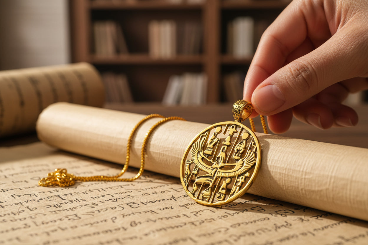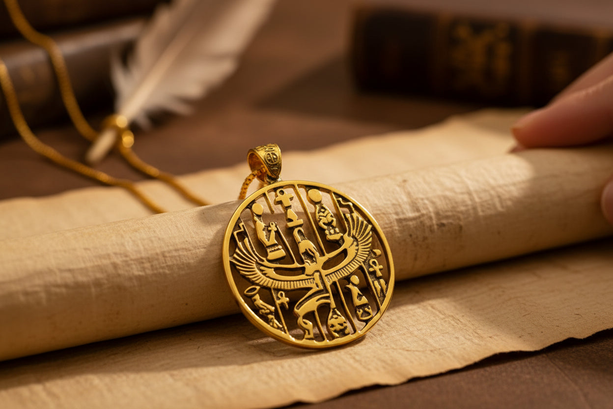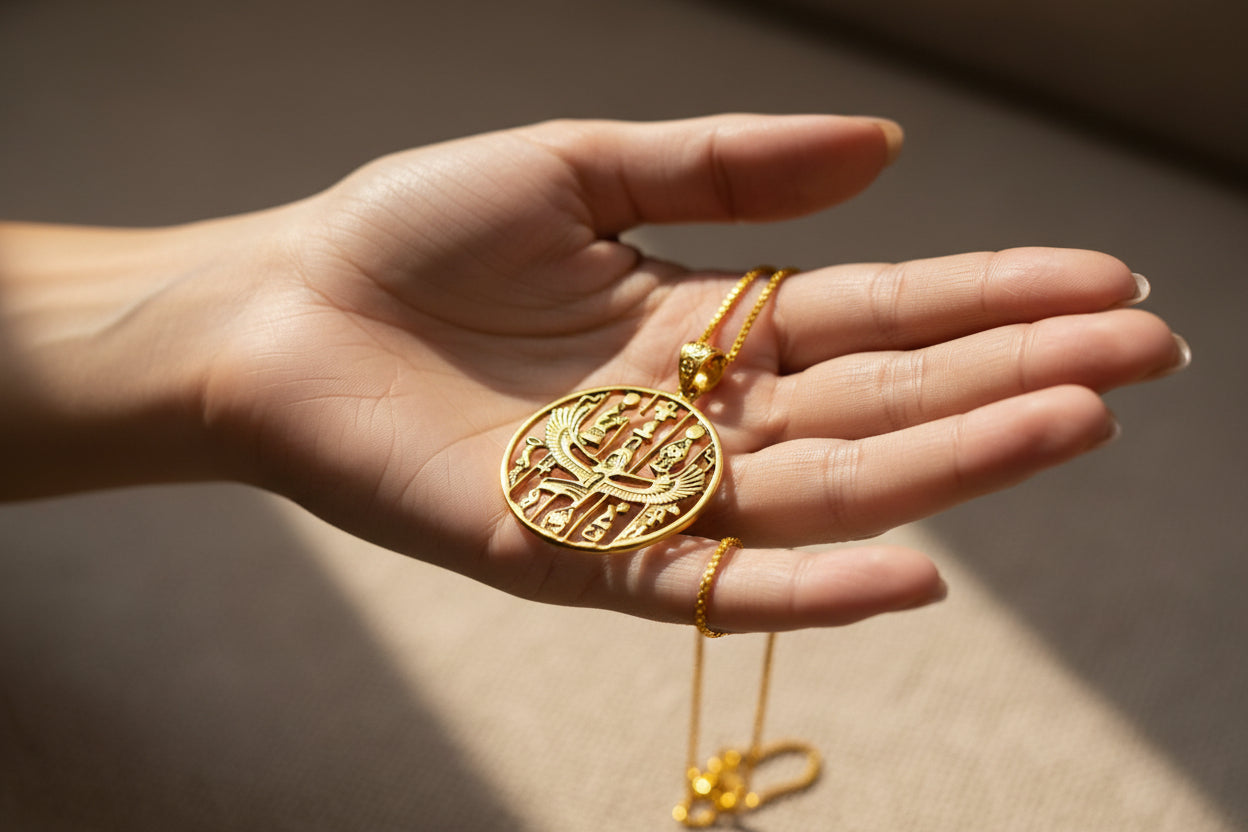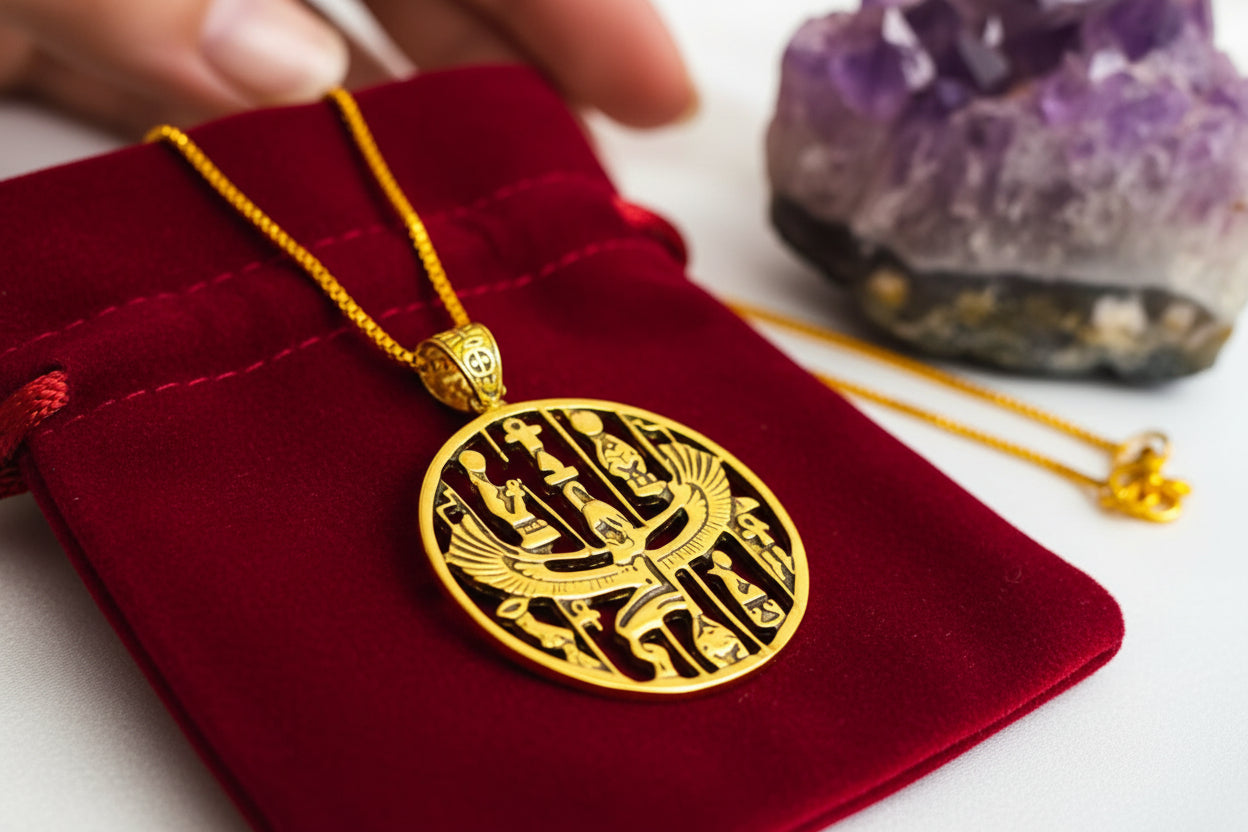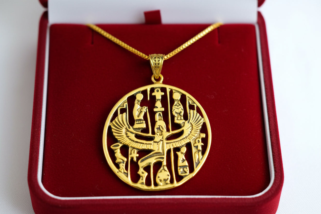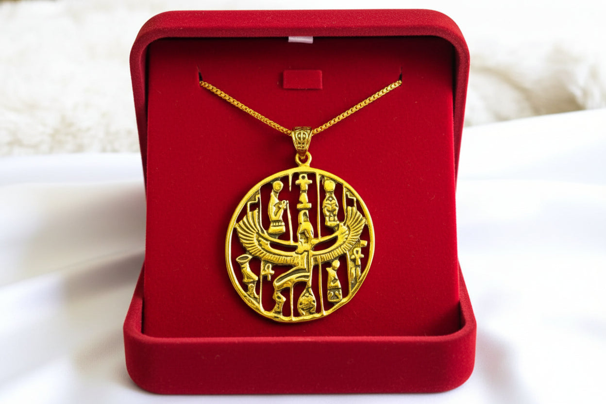 Honor the divine feminine with our handmade Gold Goddess Isis Pendant—an ancient talisman of healing, magic, and rebirth. Crafted from 5% gold and 95% brass, it features a warm vintage finish and unisex design that fits any chain up to 5mm. Sold as a pendant only, no chain.