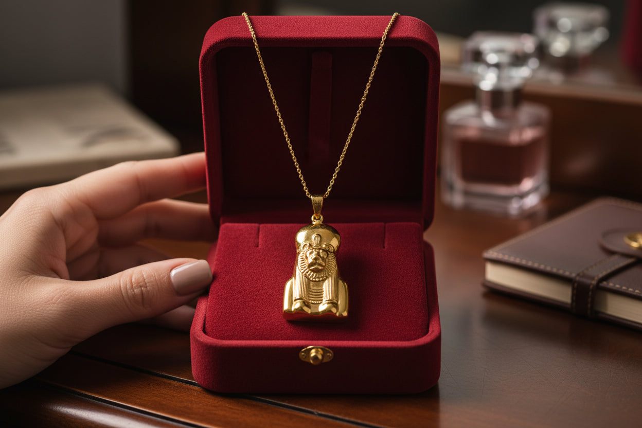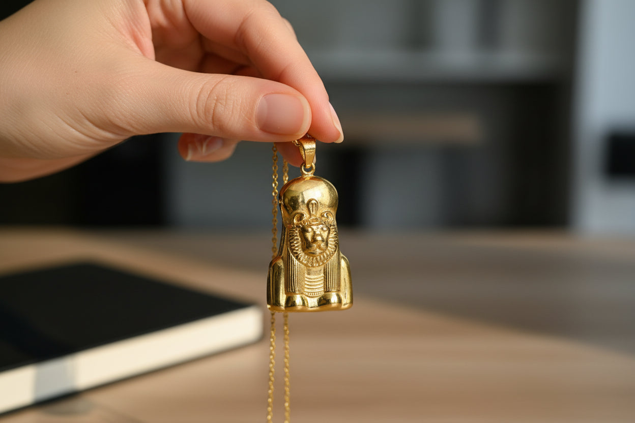 Honor the fierce energy of Sekhmet, the Egyptian goddess of war, healing, and protection. This handmade pendant is crafted from a vintage-style alloy of 5% gold and 95% brass, with an antique finish that symbolizes strength and divine power.