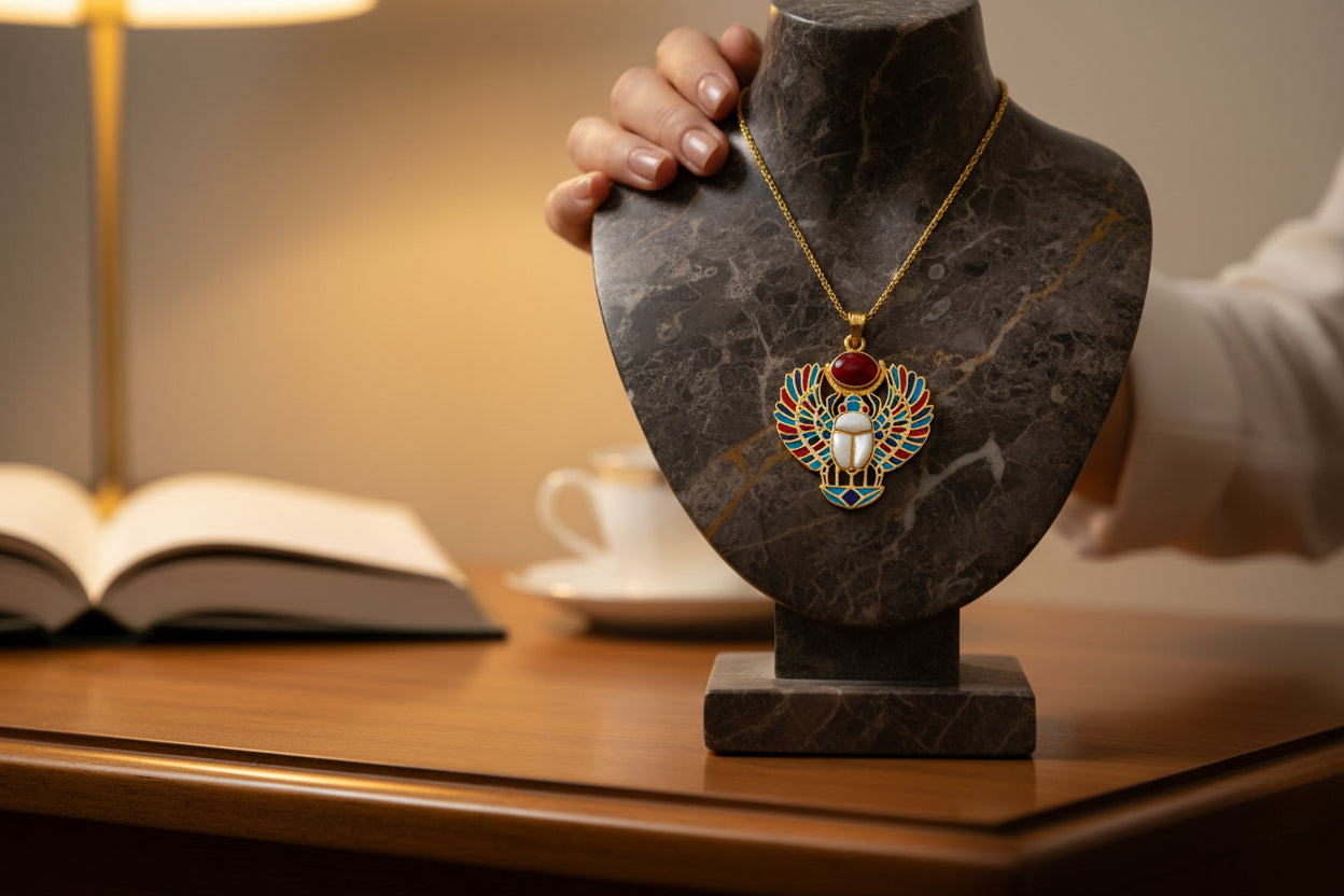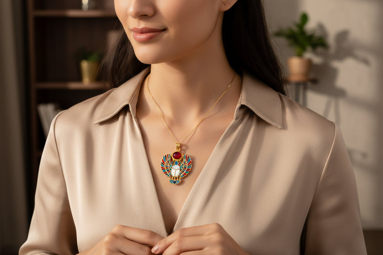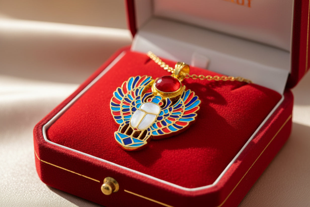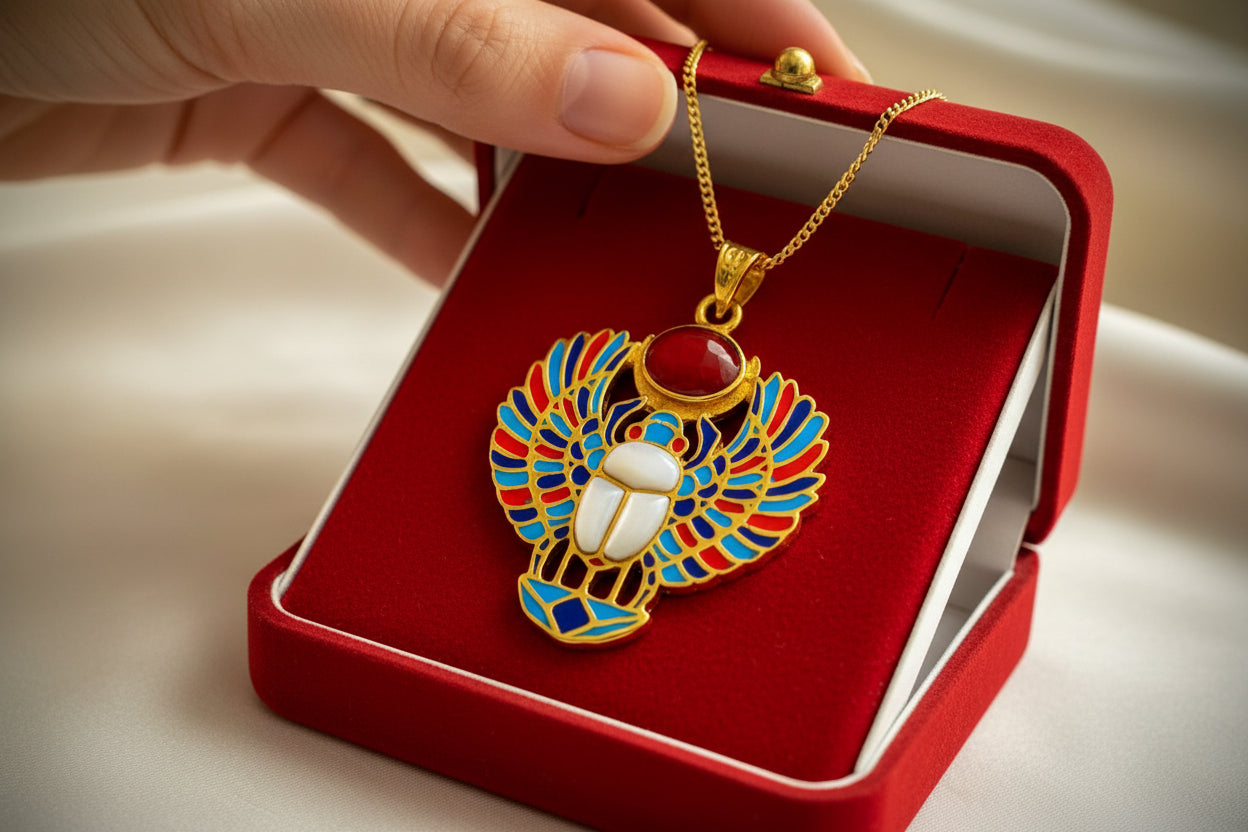 Embrace ancient power with our Gold Royal Winged Scarab Pendant—a handcrafted talisman of transformation, protection, and rebirth. Made from a vintage-finish alloy of 5% gold and 95% brass, it features a luminous mother of pearl center, crowned with a red agate sun disk for vitality.